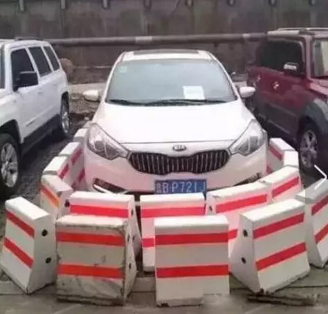 2016年6月,武漢一輛紅色雪弗蘭轎車的前后方被幾個(gè)大石墩圍住,該車主的停車位置靠近地下車庫(kù)出口,是消防通道,不能停車。此前物業(yè)曾多次勸阻和警告其不能在此停車,他卻并不聽勸,只能出此“下策”。