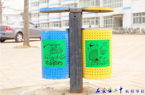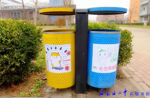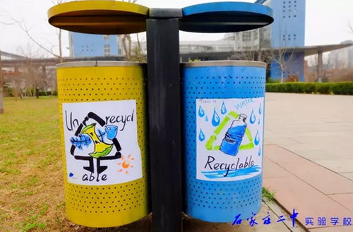 2016年3月18日,石家莊二中實驗學校2015級高一11班全體66名同學利用班級值周的時間,手繪百幅垃圾分類標志,為校園垃圾桶換上了“新裝”。18日上午,高一11班教室內,66位同學拿起五顏六色的水彩筆,在紙張上設計出各種各樣的“垃圾分類”標識和警示語,內容涵蓋了分類標志、垃圾擬人、科普漫畫等,圖面生動有趣。次日下午,同學們又從教室奔向校園每個角落,將精心繪制的圖案張貼在校內所有的垃圾桶上,提醒過往師生將垃圾分類,維護我們共同的家園。