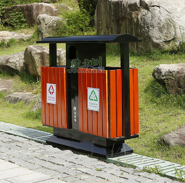 鋼木木條垃圾桶都是采用的防腐木材質制作而成,例如這款欣方圳的G97戶外鋼垃圾桶,其木材常采用松樹樹種,但是在做成成品之前,木材均要經過防腐藥水浸泡,烘干(自然晾干或是高溫烘干),噴漆等工藝,經過這些工藝的制作,使傳統一般的木材變得具有很好的防腐蝕性和防潮的功效。