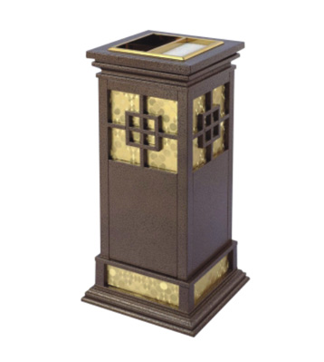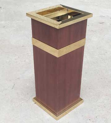 • 產品材質:酒店鈦金垃圾桶采用不銹鋼鋼板拉絲咖啡色或玫瑰金制作而成,另產品可做四面大理石用鋼板螺絲固定于桶體,有內桶,方便提倒垃圾,桶頭煙灰盅可放白石子可清洗,鋼板經折彎沖壓一次性成型。產品一律用室外粉靜電噴塑,經過180°的高溫,延長垃圾桶使用壽命,顏色持久不變亮麗如新。